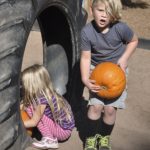 Each class listened intently to “One, two, three…” and some eager bodies shot out to the yard before I gave the magic word. After being reeled back to the wall a few times because they were having so much fun and I couldn’t resist trying this “trick” a few more times, they charged successfully out into the yard to locate their treasure! Then with muscles bulging they lifted the heavy pumpkins and headed to the front yard to cuddle and pet goats, chickens, chicks, ducks and rabbits.